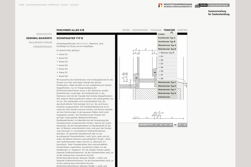 Wie variantenreich die weitgehend in Privateigentum umgewandelte Hufeisensiedlung ist, macht eine Zahl deutlich: Es gibt zwar nur vier Hausgrößen mit jeweils zwei Dachtypen. Nimmt man aber alle Details zusammen, unterscheiden Experten unter den 679 Reihenhäusern insgesamt 285 Varianten und Subtypen. Das gleiche gilt auch für die Gärten, die in dieser Zahl noch nicht eingerechnet sind. Um die durch die Privatisierung stetig wachsende Zahl privater Eigentümer über die richtige Erhaltung und Instandsetzung aller denkmalgeschützten Details zu informieren, startete der lokale Verein der "Freunde und Förderer der Hufeisensiedlung" gemeinsam mit dem Berliner Landesdenkmalamt und zwei vor Ort wohnenden Denkmal-Experten eine Initiative. Sie akquirierten Fördermittel für die Umsetzung einer Website, die 2011 online ging und einen geschützten Zugang zu knapp 2000 haus- oder wohnungsindividuellen Micro-Sites bietet. Nach Eingabe von Passwort, Straße und Adresse gelangt man zu einer individuell zusammengestellten Unterseite mit jeweils eigener Navigation und zahlreichen Detailplänen, Konstruktions-, Material-, Maß-, Pflanz- und Farbangaben. Auch ein Forum, ein Vereins- und ein Geschichtsteil wurden integriert.